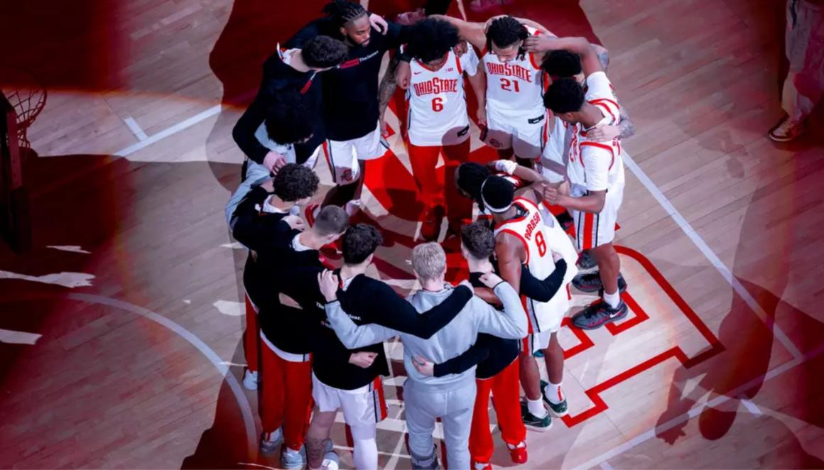 The Buckeye's team huddle before a home game in the 2024-2025 season (Photo: Ohio State Athletics).
